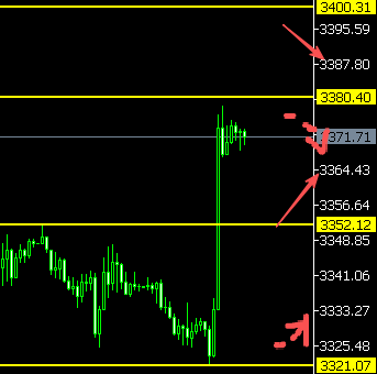 2、处在3380下方,再次调整,下方先是看到3352的支撑。此位置支撑有效,再次反弹,继续看挑战3380的位置。